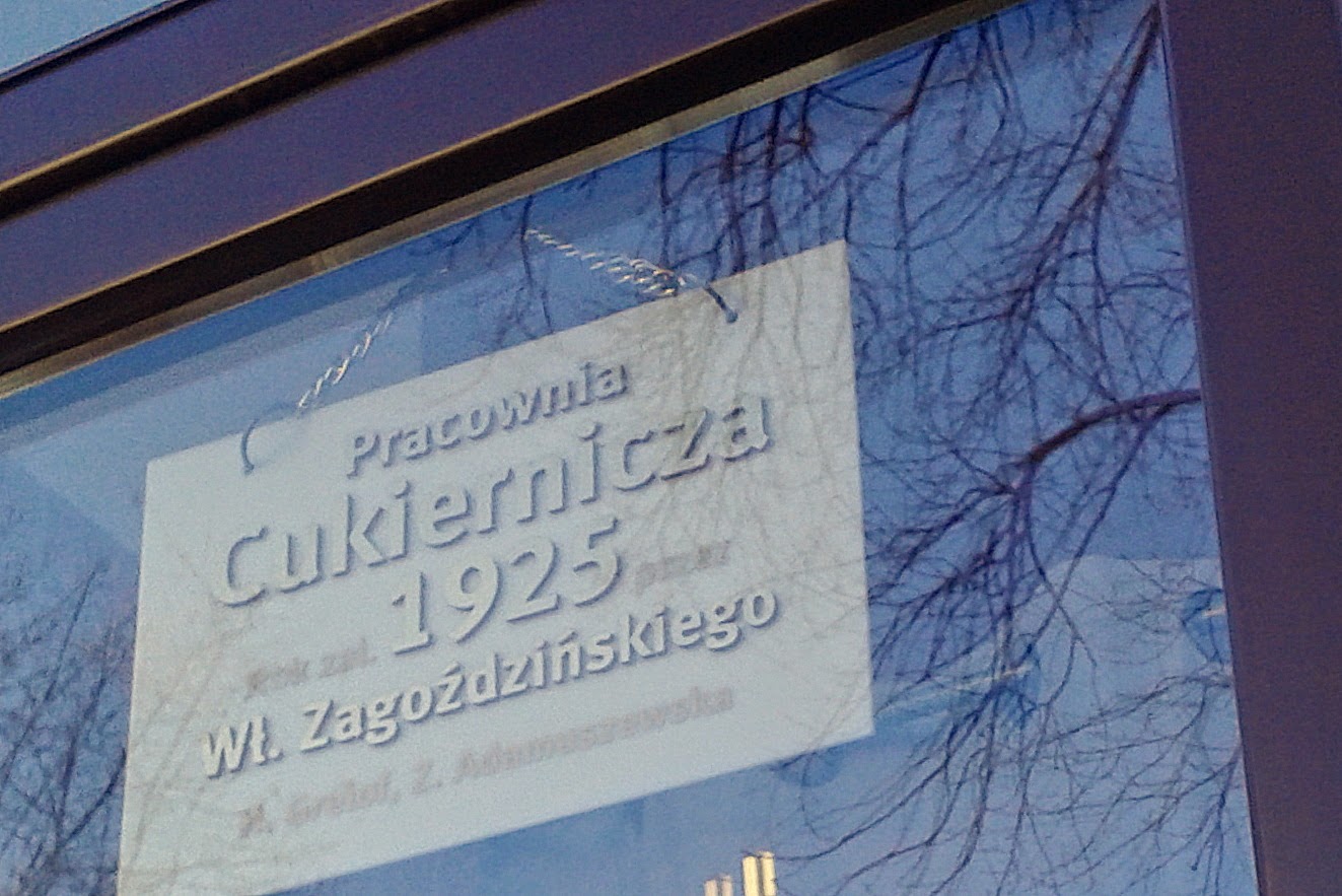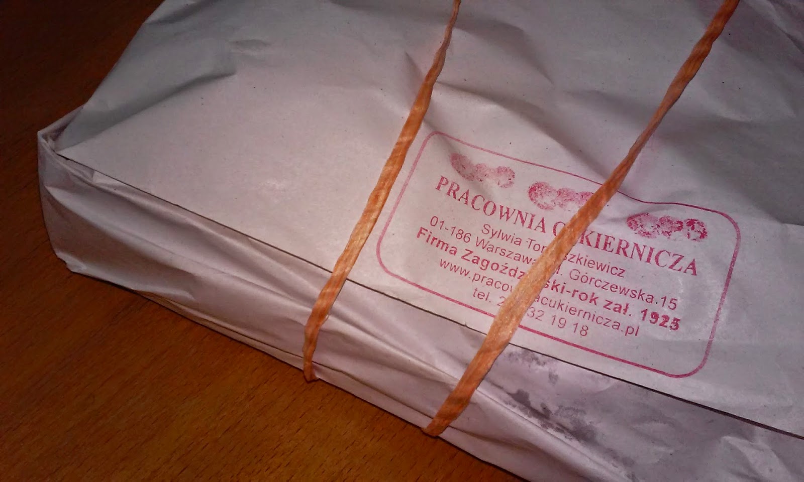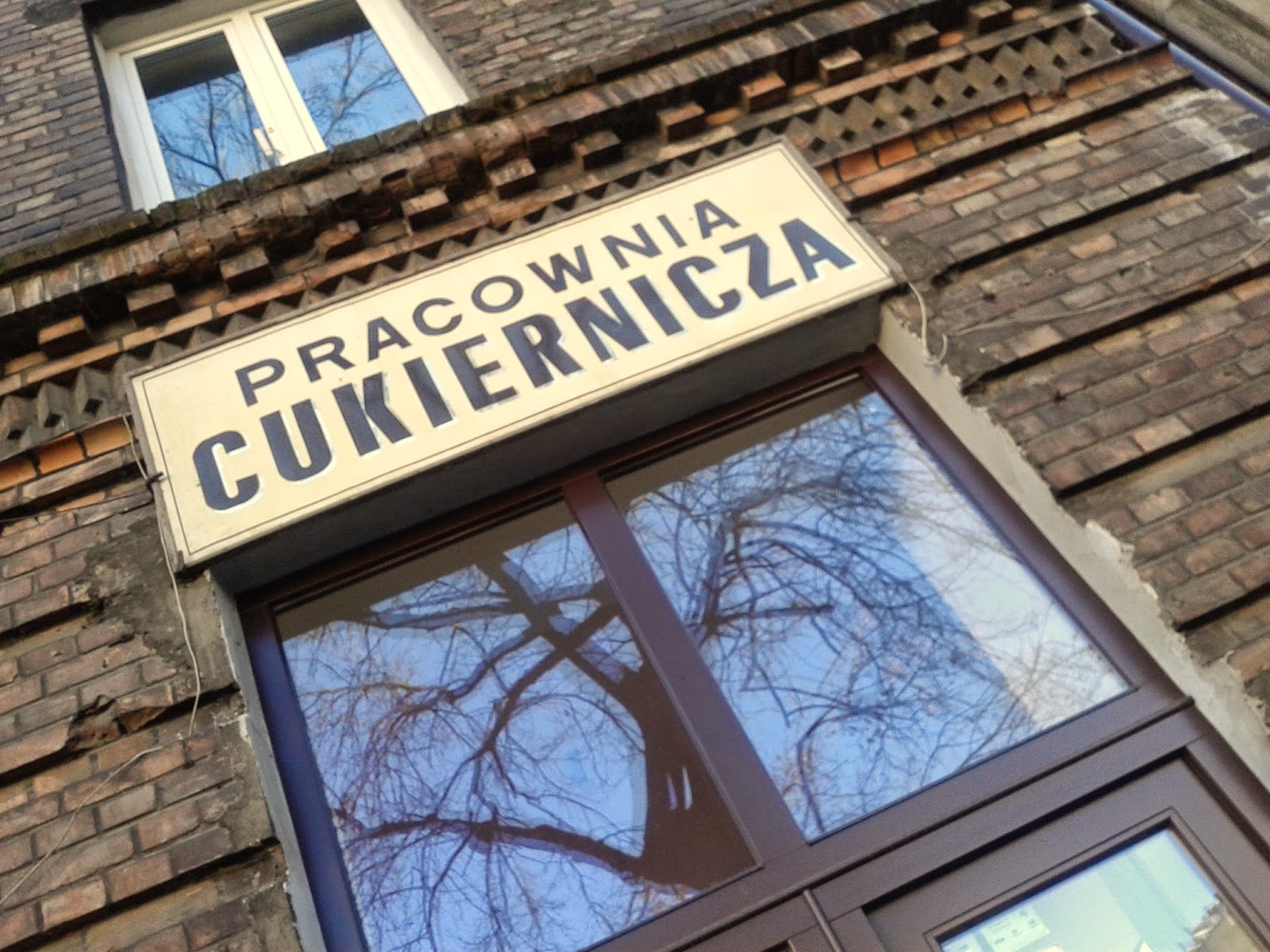 Mimo, że Pracownię Cukierniczą odwiedziliśmy w zupełnie zwykły wtorek, o zupełnie zwykłej 13.00 godzinie, to i tak na miejscu zastaliśmy kolejkę, w której spędziliśmy 40 minut. W międzyczasie przeczytałam reklamę na murze obok wejścia. Było to napisane (sądząc po błędzie - przez dziecko) kredą jedno zdanie: Ponczki są dobre. Zachęceni tym szczerym wyznaniem staliśmy dalej, mimo mrozu i niemiłego wiatru. Po 40 minutach weszliśmy do wnętrza cukierni, gdzie mogliśmy zobaczyć jak Panie ekspedientki szybko i ładnie zawijają pączki w papier i przewiązują wstążką, tworząc zgrabną paczuszkę, w której bez problemu można transportować pączki bez ich zgniecenia. Jednak z takiego zawiniątka trudno wyjąć pączka bez niszczenia opakowania, dlatego Mat, który już nie mógł się doczekać, poprosił o jeszcze jedną sztukę - do ręki. Nadprogramowego pączka zjedliśmy dosłownie w 10 sekund. Był tak świeży, tak rozpływał się w ustach, jak chyba jeszcze żaden pączek, którego w życiu jadłam.